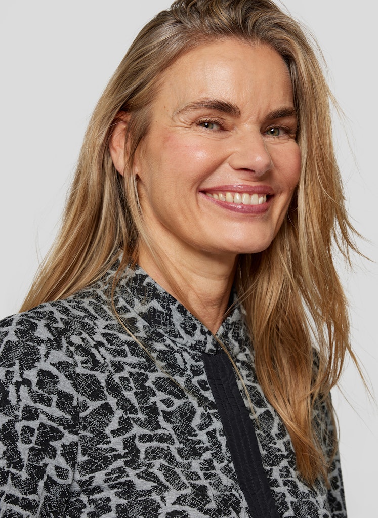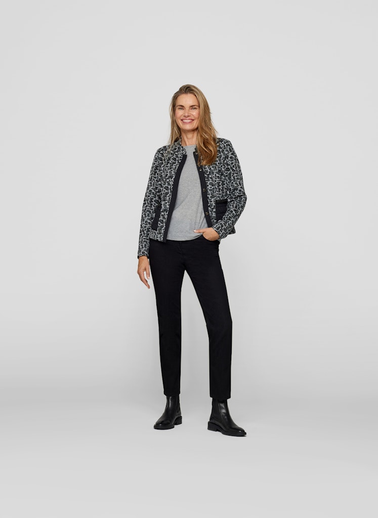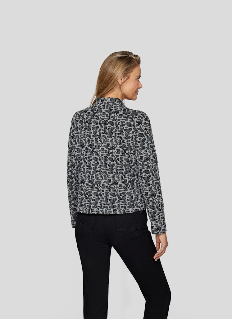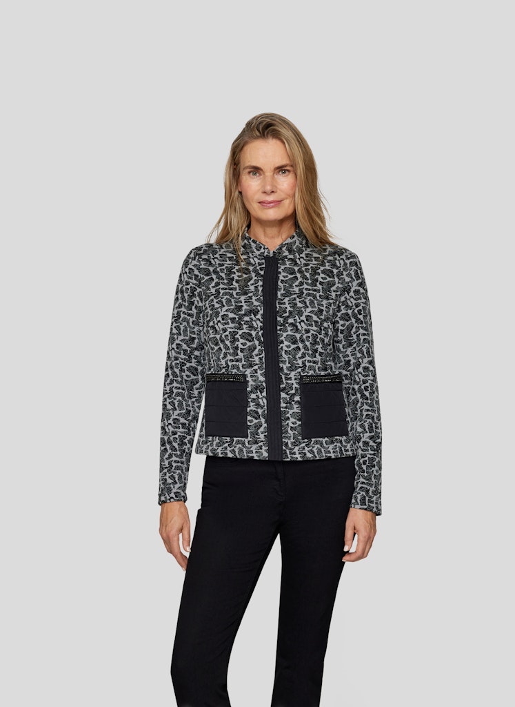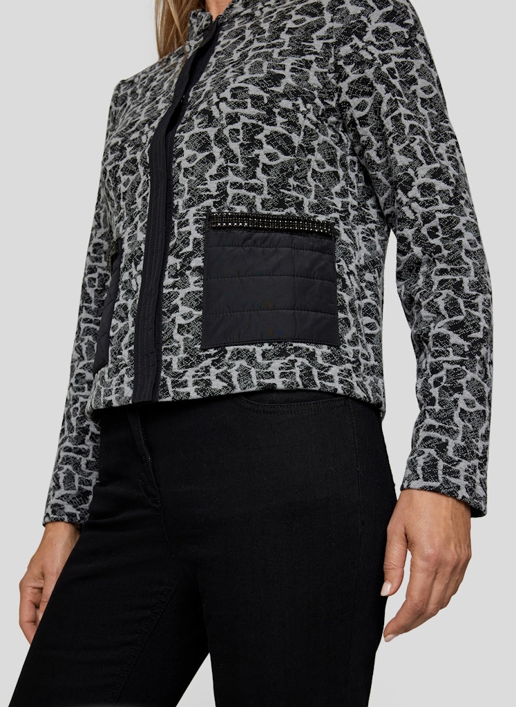 Moderne Eleganz mit Statement-Charakter: Diese Jacke von RABE kombiniert einen aufregenden Schwarz-Grau-Print mit stilvollen Details für einen einzigartigen Look. Auffälliger Print _ Moderner Schwarz-Grau-Mix für einen markanten Stil. Stehkragen _ Verleiht der Jacke eine elegante und selbstbewusste Note. Dekorative Taschen mit Ziersteinen _ Ein edler Hingucker. Perfekt für einen stilvollen und komfortablen Alltagslook.