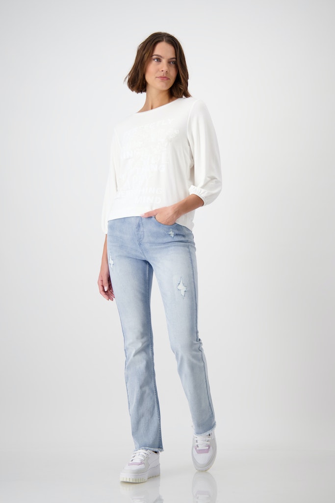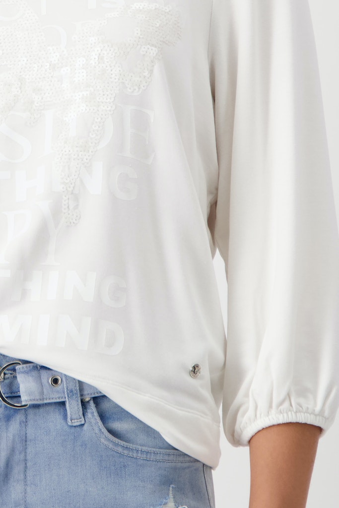 Dieses Shirt in sanfter Haptik vereint einen Schmetterling aus Pailletten mit toniger Schrift.