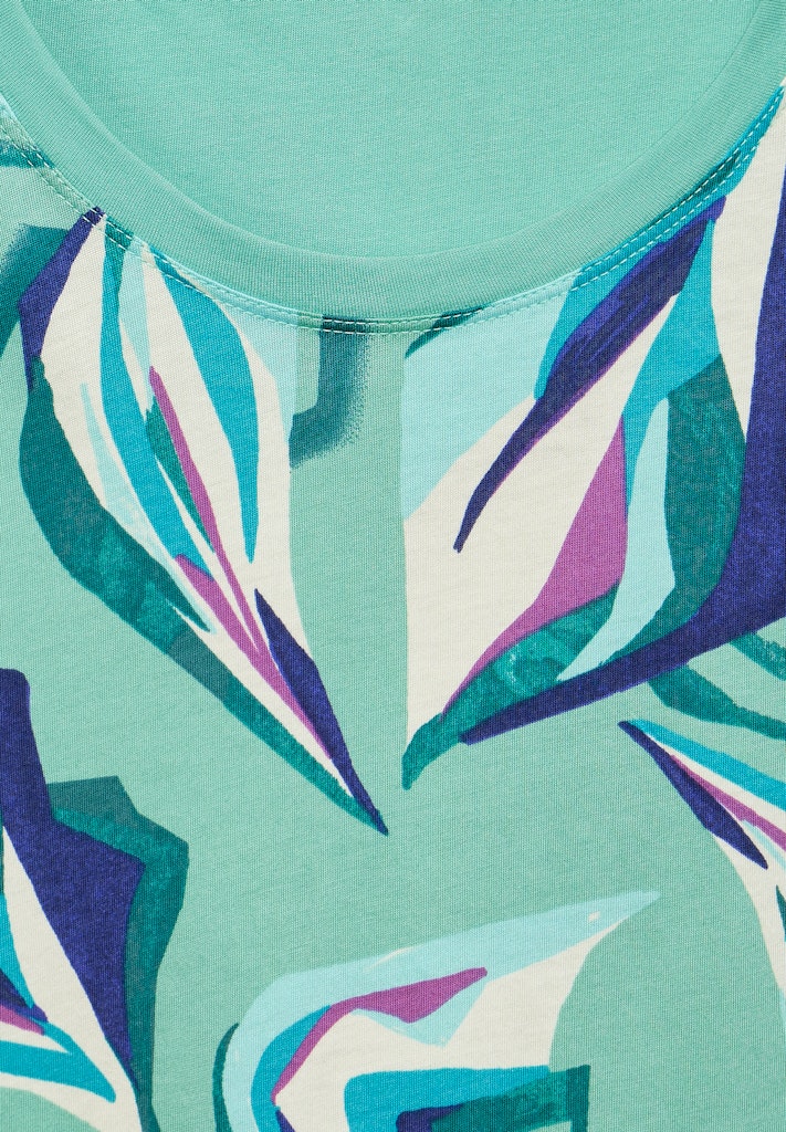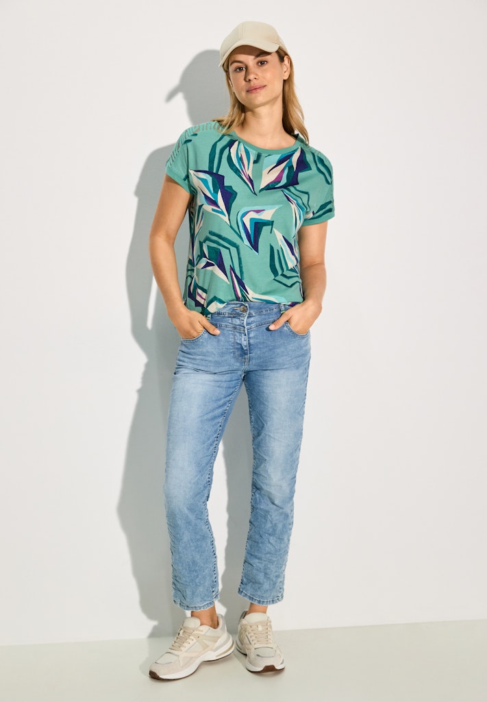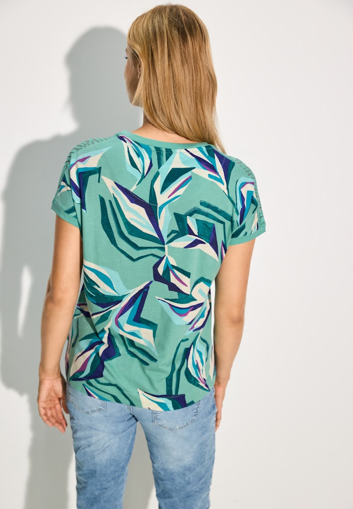Setze Akzente mit diesem modischen Ausbrenner T-Shirt mit Print von CECIL. Mit seinem ansprechenden grafischen Blätterprint und transparenten Elementen an den Schultern wird das Sommershirt zum Hingucker. Zudem verfügt es über einen Rundhalsausschnitt und seitliche Schlitze im Saum. Sommershirt Rundhalsausschnitt Transparenter Ausbrenner Schultereinsatz Grafischer Blätterprint Seitliche Schlitzte im Saum Material: 50% Baumwolle, 50% Modal