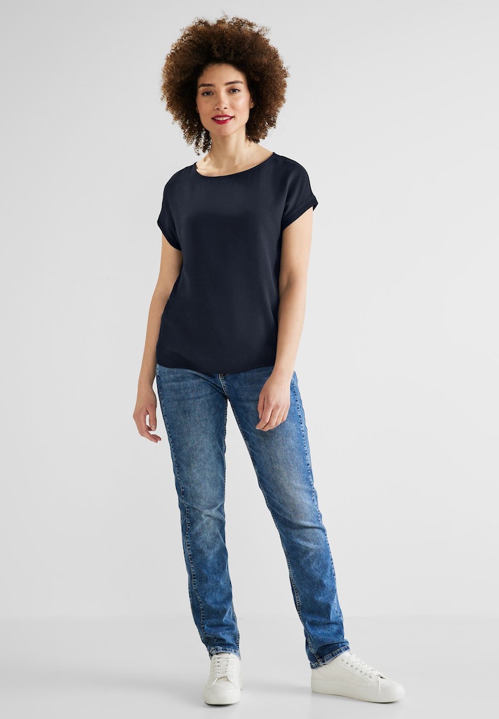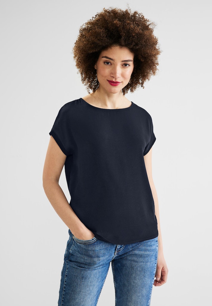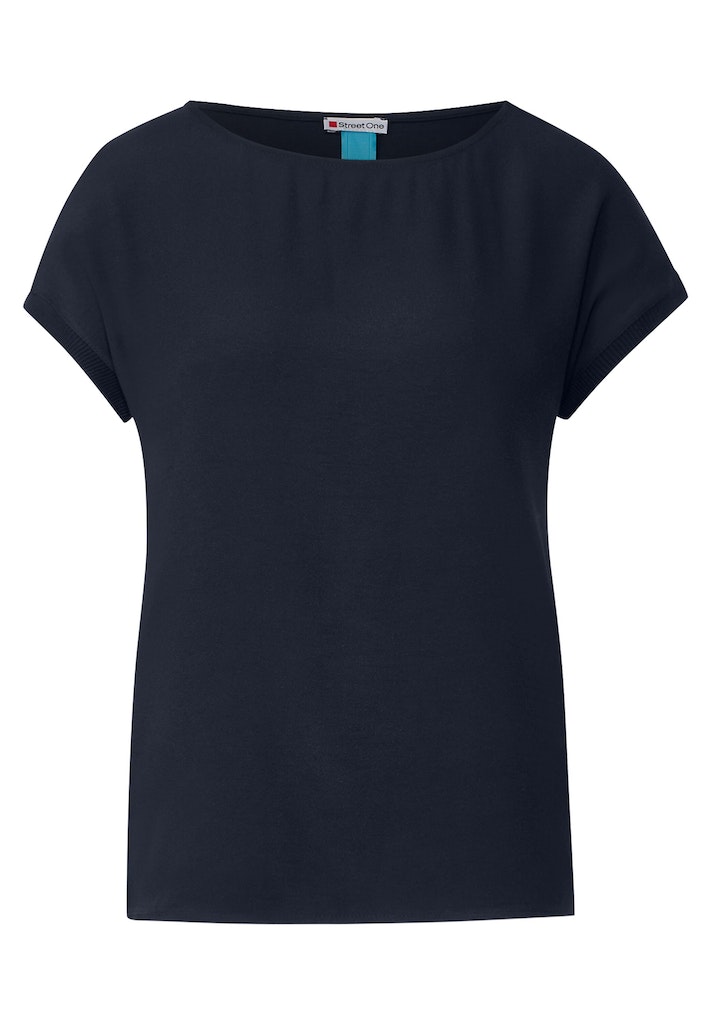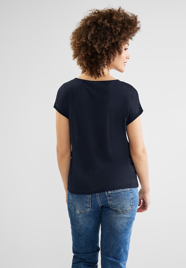 Fashion Statement! Im femininen Materialmix überzeugt dieses unifarbene Damenshirt von Street One. Überschnittene Schultern und U-Boot Ausschnitt geben ihm etwas Lässiges. Die Ripp Details setzen einen dezenten Blickfang.