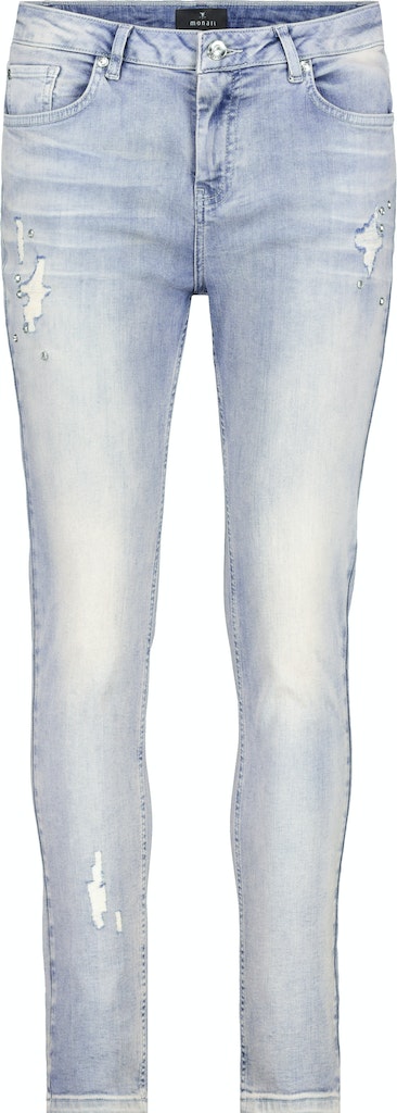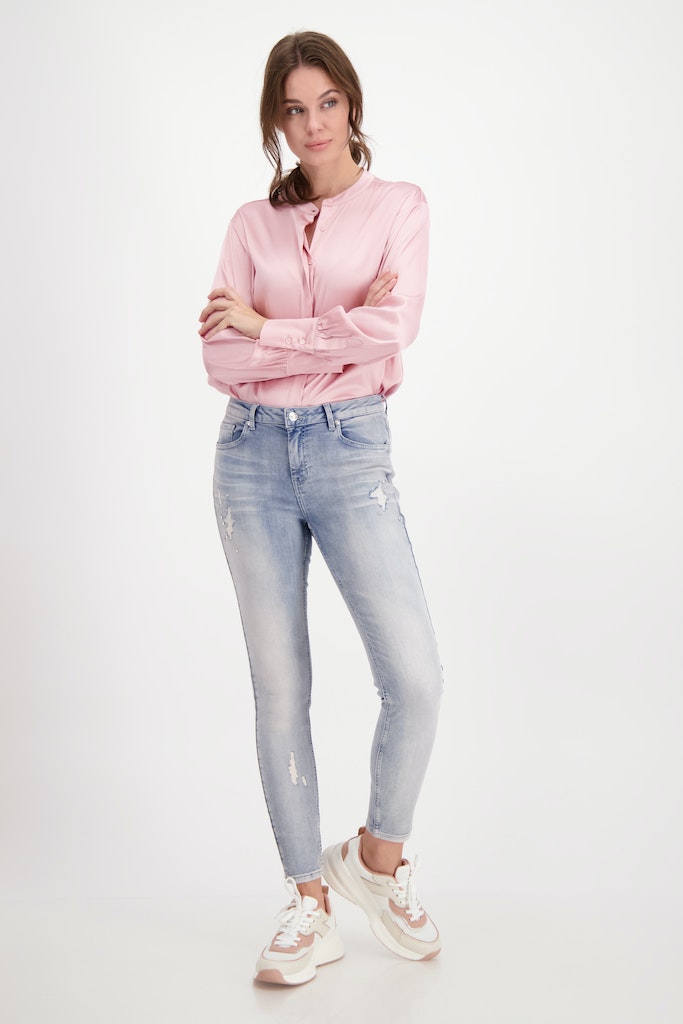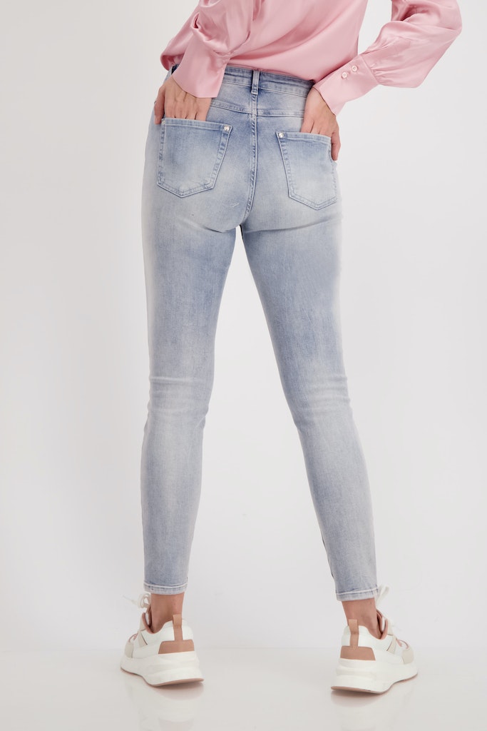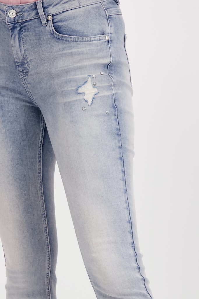Durch den Used Look bekommt diese Slim Fit Jeans von monari ein stilvolles Design. Der Destroyed Effekt mit Schmuck wertet die Destroyed Jeans gekonnt auf. Die Jeanshose kommt im klassischen 5 Pocket Style mit Gürtelschlaufen am Bund und einer normalen Leibhöhe. Problemlos öffnen und schließen lässt sich die Denim Jeans mit einem Knopf und einem verdeckten Reißverschluss. Die anschmiegsame Stretch Qualität sorgt dabei für passgenauen Sitz und ausgezeichneten Komfort. Durch die Spezialeffekte wird die 5 Pocket Jeans zum wahren Hingucker. Sie lässt sich zu unzähligen Outfit Inspirationen kombinieren. Diese Damen Jeans darf in keiner Garderobe fehlen! Überzeugen Sie sich selbst.