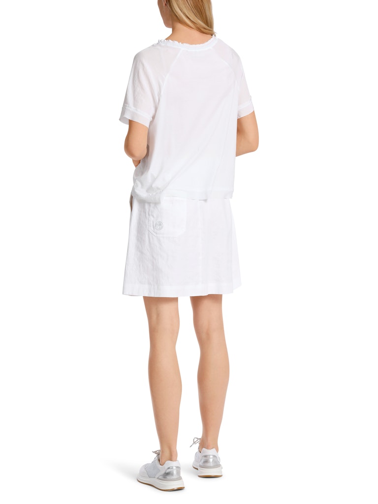 Sportives Blusenshirt|Für einen lässigen Look sorgt dieses weit geschnittene Blusenshirt. Es kommt im weich fallenden Materialmix und besitzt offene Kanten. Der V-Neck hält durch das gestreifte Bändchen seine Form. Viertellange Raglanärmel unterstreichen das sommerliche Feeling.|Weiter Schnitt|Gestreiftes Bändchen|Made in Europe|Weicher Materialmix|Das Model ist 179 cm groß und trägt N3/38.