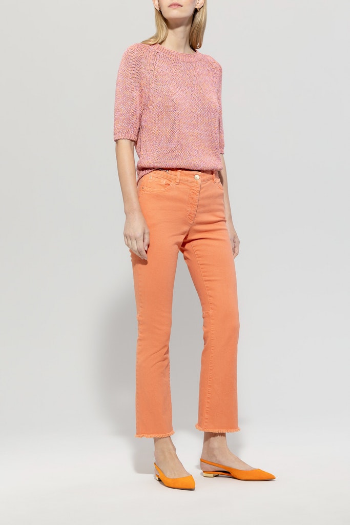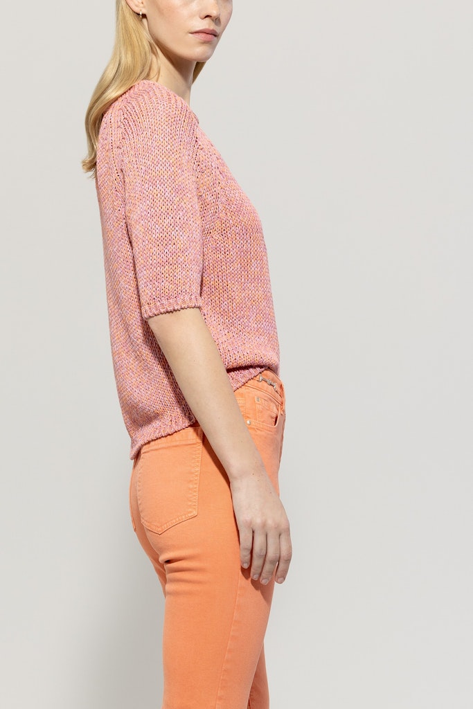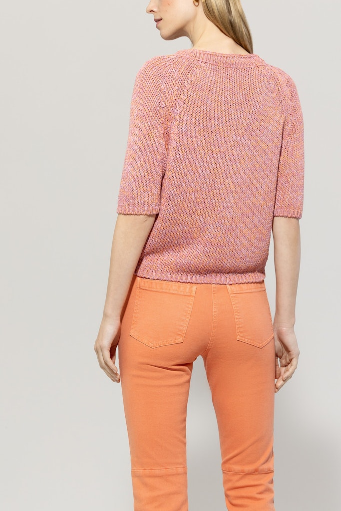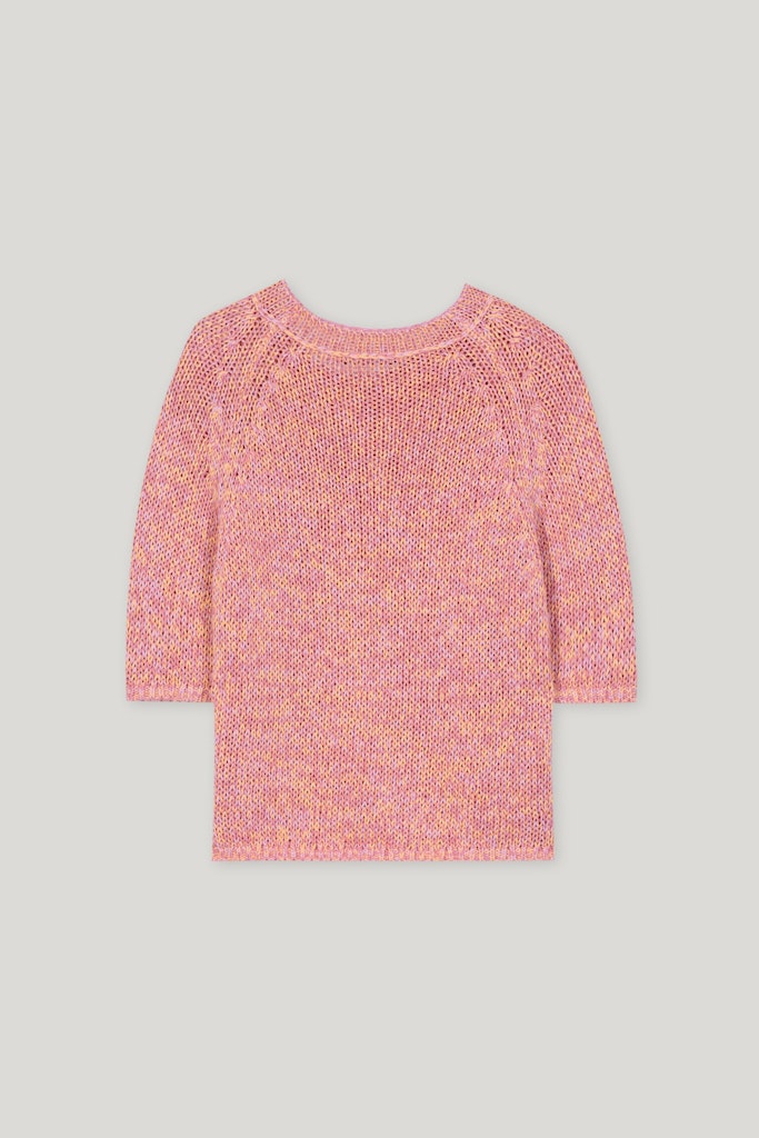 Strickpullover aus sommerlich buntem Tape-Garn. Das Design zeigt sich mit halblangen Ärmeln, einem Rundhalsausschnitt und gerippten Saumkanten.