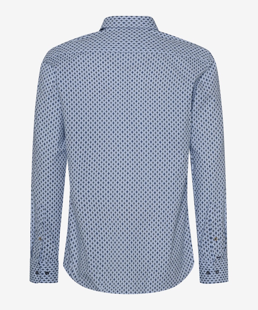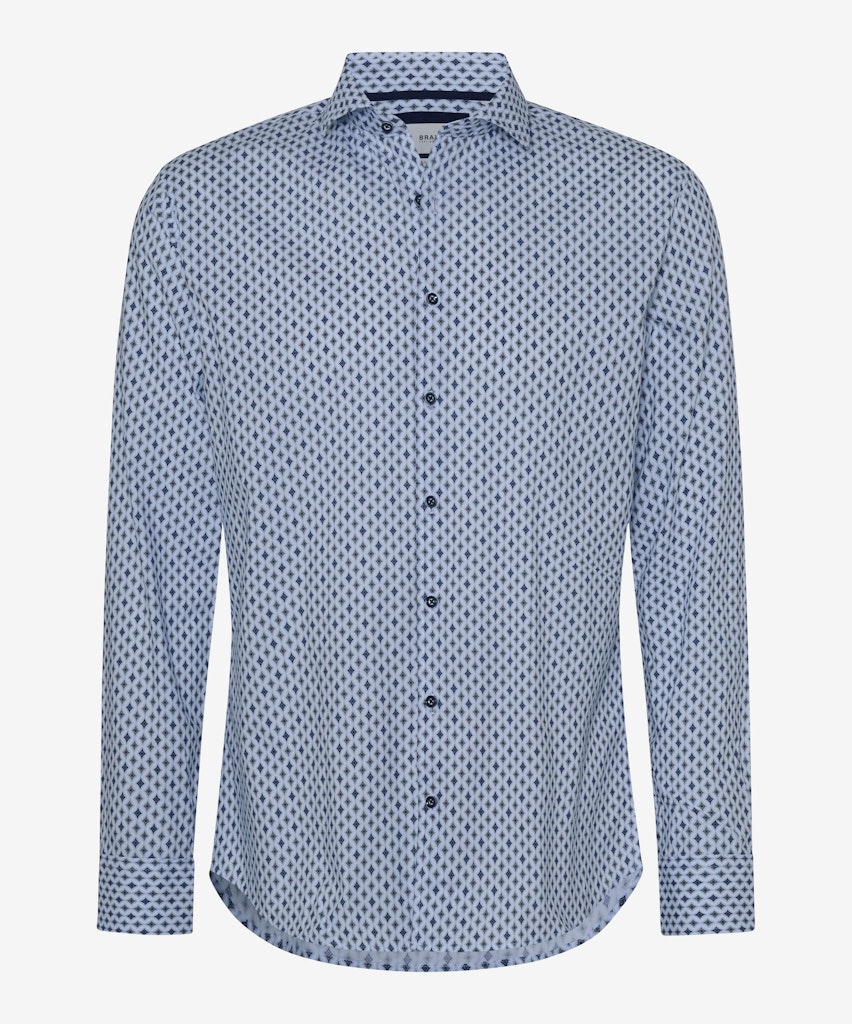 Definiert moderne Eleganz neu: das Herrenhemd im Style HAROLD. Ausgestattet mit einem markanten Haifisch-Kragen und verziert mit einem dezenten Minimalprint, strahlt es einen smarten Look aus. Die leicht taillierte Silhouette des Hemdes unterstreicht mit einer perfekte Passform die zeitgemäße Optik des Hemdes. Bei der Materialauswahl setzt das Langarm-Hemd auf die exklusive Hi-FLEX-Qualität von BRAX. Diese hochwertige Popeline, ein geschmeidiger Mix aus Baumwolle und Elasthan, steht für angenehmen Tragekomfort und gewährleistet eine außergewöhnliche Bewegungsfreiheit.Form: