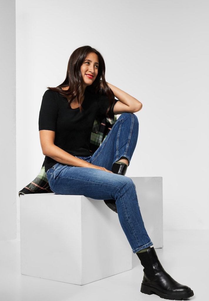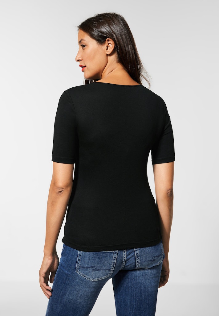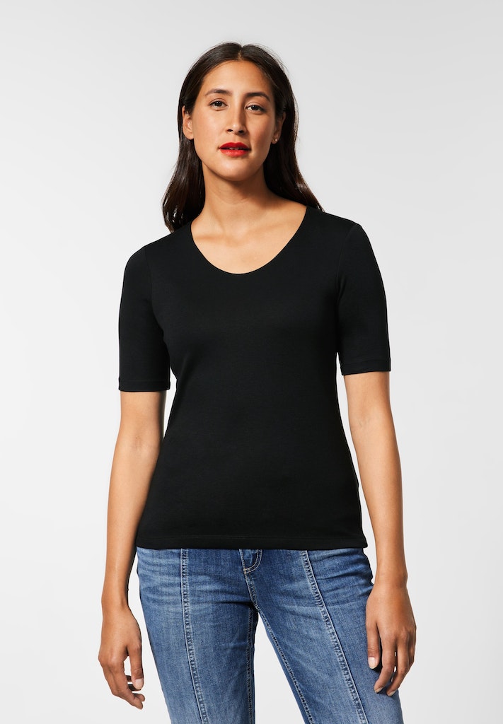Basic geht immer! Frühlingsfrisch zeigt sich das Damen T-Shirt im neuen Style Palmira von Street One. Mit V-Ausschnitt und im Basic Style ist es ein Klassiker im Kleiderschrank. Die halben Ärmel ergänzen den Look.