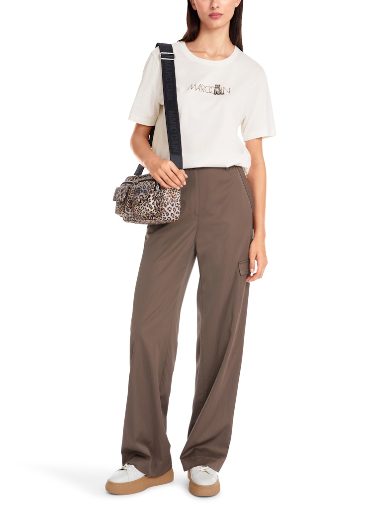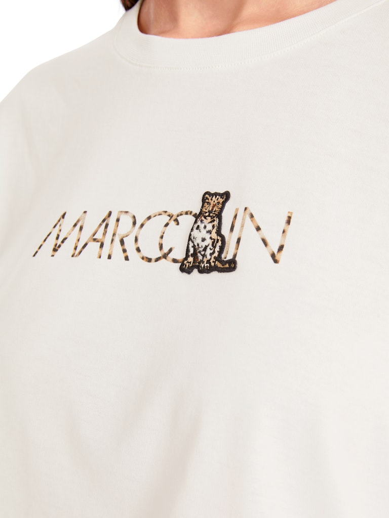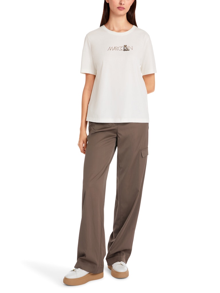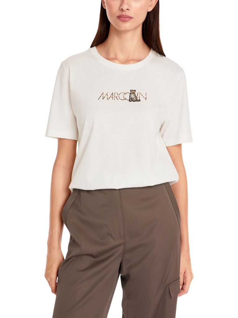 T-Shirt mit Leo-Motiv "Rethink Together"|T-Shirt aus feinem Baumwoll-Jersey. Der Schnitt ist locker und die Form gerade. In der Front erscheint der Marc Cain Schriftzug mit einem applizierten Leoparden-Motiv. Ein vielseitiger Basic. Die Produktion erfolgt nach ökosozialen Kriterien und das Modell trägt das Nachhaltigkeitslabel "Rethink Together".|Gerade Form|Rethink Together|Locker geschnitten|Druck & Applikation|Das Model ist 179 cm groß und trägt N3/38.