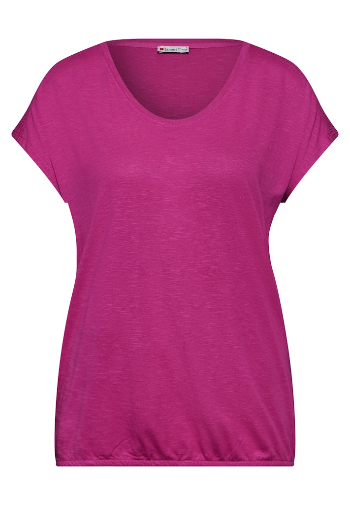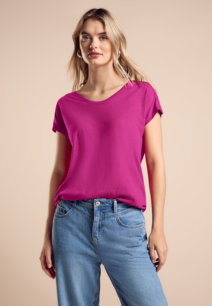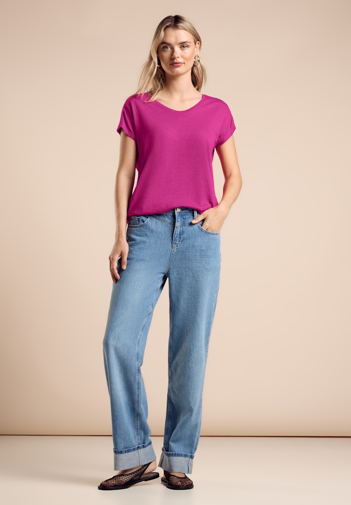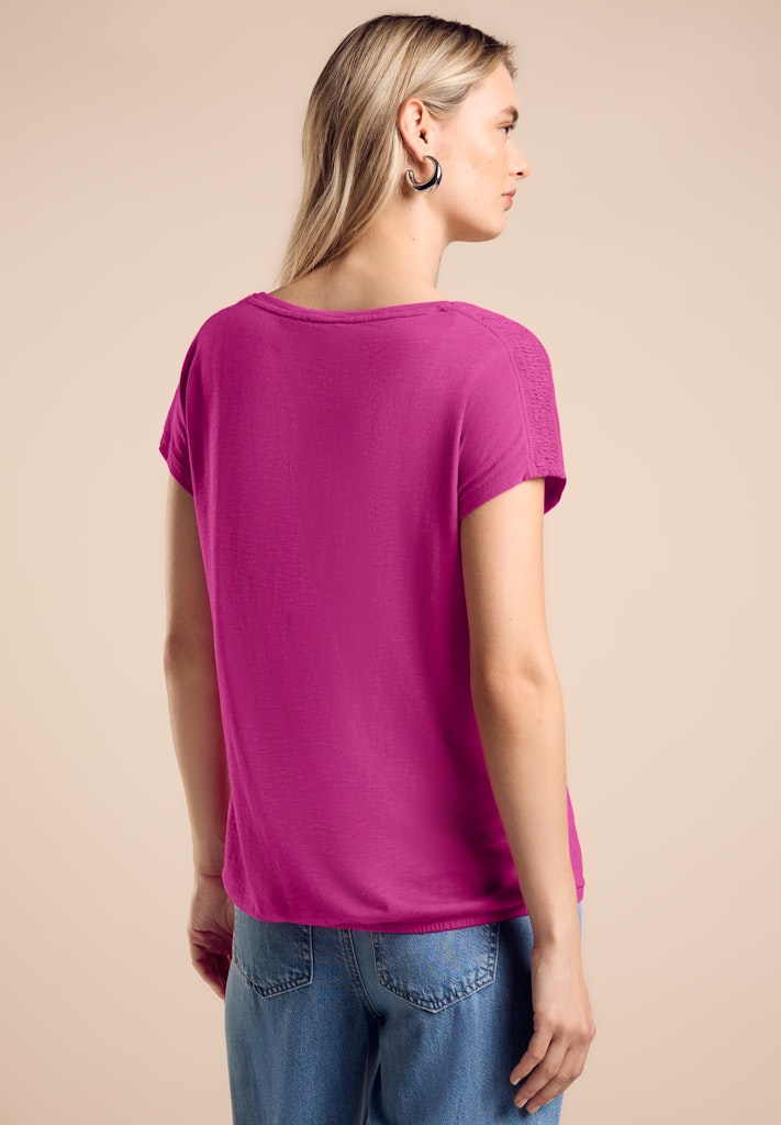 Das T-Shirt mit Smock-Detail von Street One für Damen verfügt über einen gerundeten V-Ausschnitt und Armansatz. Das Smock-Detail an der Schulter macht das leichte Shirt zu einem stilvollen Basic. Der Baumwoll-Modal-Mix sorgt für leichten und bequemen Tragekomfort. Leichtes Shirt Gerundeter V-Ausschnitt Armansatz Smock-Detail an der Schulter Baumwoll-Modal-Mix Material: 50% Baumwolle, 50% Modal
