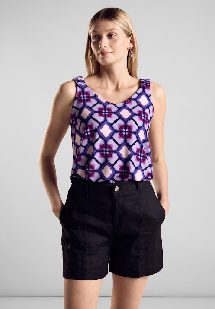 Das Top mit Print von Street One für Damen ist ein modisches Sommertop mit einem schmeichelhaften V-Ausschnitt und gerafften Trägern. Hergestellt aus Viskose mit Stretchanteil bietet es eine optimale Passform und Bewegungsfreiheit. Perfekt für warme Tage, verleiht dieses Top deinem Look einen trendigen und femininen Touch.