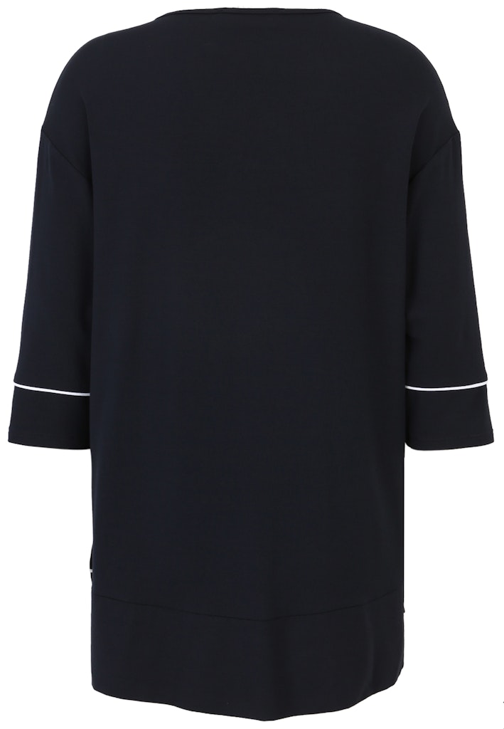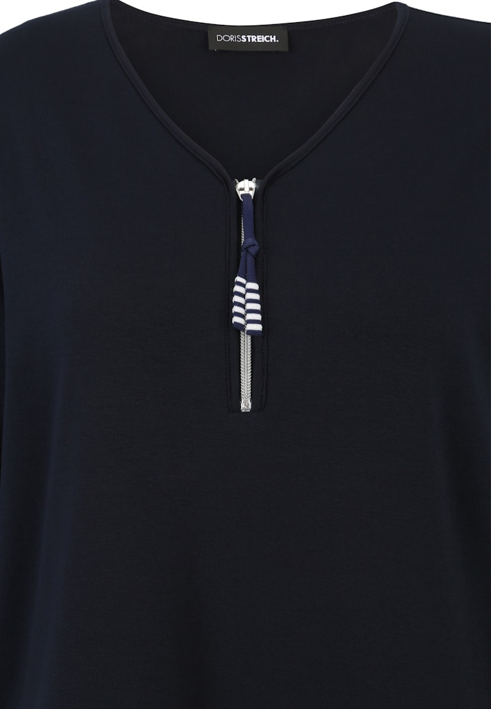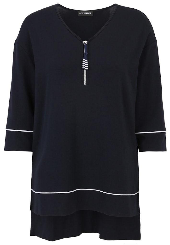 Das lässig überschnittene Long-Shirt von Doris Streich ist ein Hingucker: Der dekorativ gestreifte Anhänger am Zipper und die weißen Paspel an den Ärmel und am Saum ziehen die Blicke auf sich. Die angesagte High-Low-Form mit verlängerter Rückenpartie