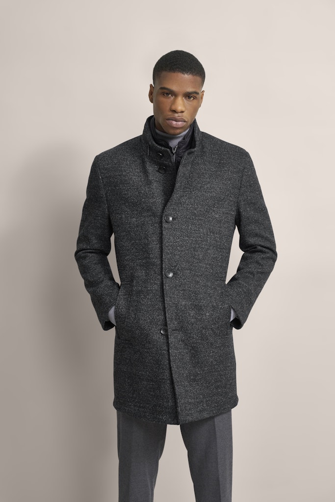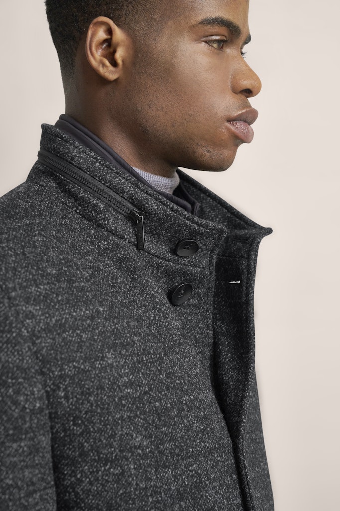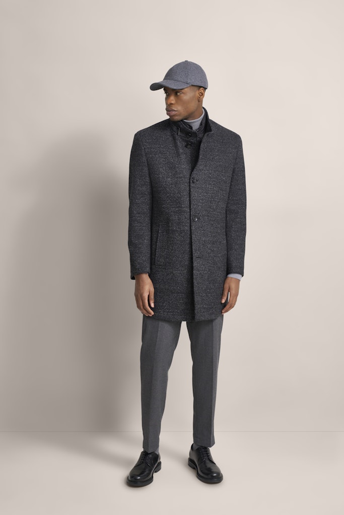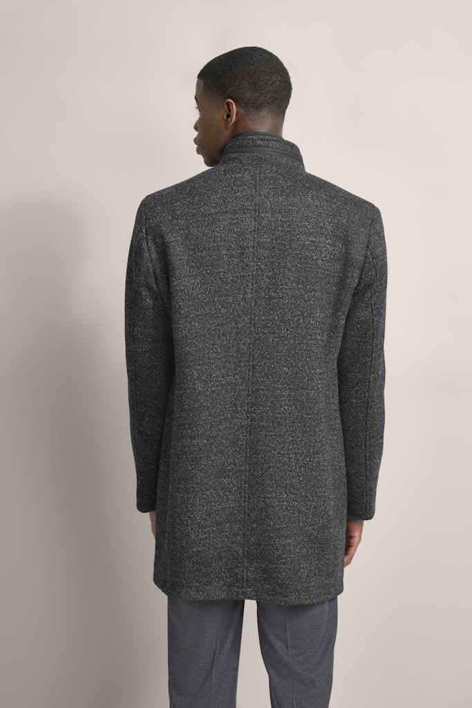 Klassischer Stehkragenmantel mit geraden eingeschobenen Leistentaschen. Mitten im Kragen ist ein Reißverschluss. Innen ist der Mantel komplett gefüttert und setzt farbliche Akzente durch die Paspeltaschen und das Ärmelfutter. Der Jersey Artikel mit stretch Funktion überzeugt mit seiner feinen Mélange-Dessinierung.
